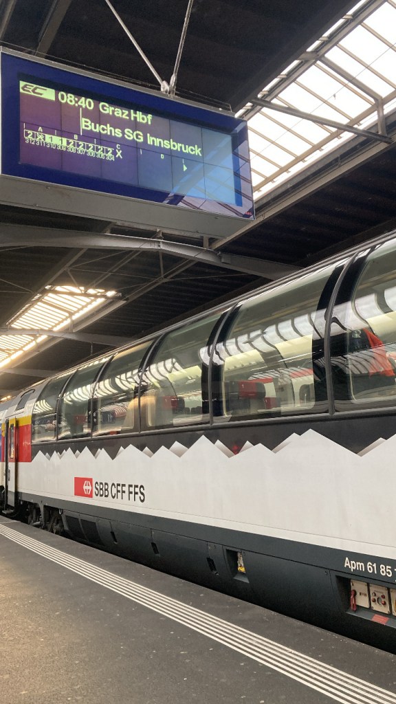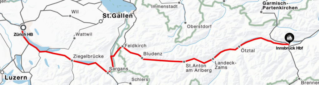Zurich main station was honoured as the best railway station in Europe in 2022 (Engel, 2022). There you find numerous stores and supermarkets, which also invite you to shop on Sundays. The train towards Austria leaves the main station on the above-ground tracks. This Railjet Xpress, has various comfort classes: second, first and business class. Departure is every two hours at 40 past. For the 280 kilometres on the rails, the train takes 3 hours 31 minutes. Compared to a car, a person travelling alone saves the equivalent of almost 40 litres of petrol (SBB, n.d.-2). Not to mention the nerves saved, which you usually need for the journey out of Zurich city by car. And many travellers and commuters know this, which is why Zurich main station is the hub of Switzerland, with around 3,000 trains carrying 400,000 passengers a day (B&B Hotels, n.d.).